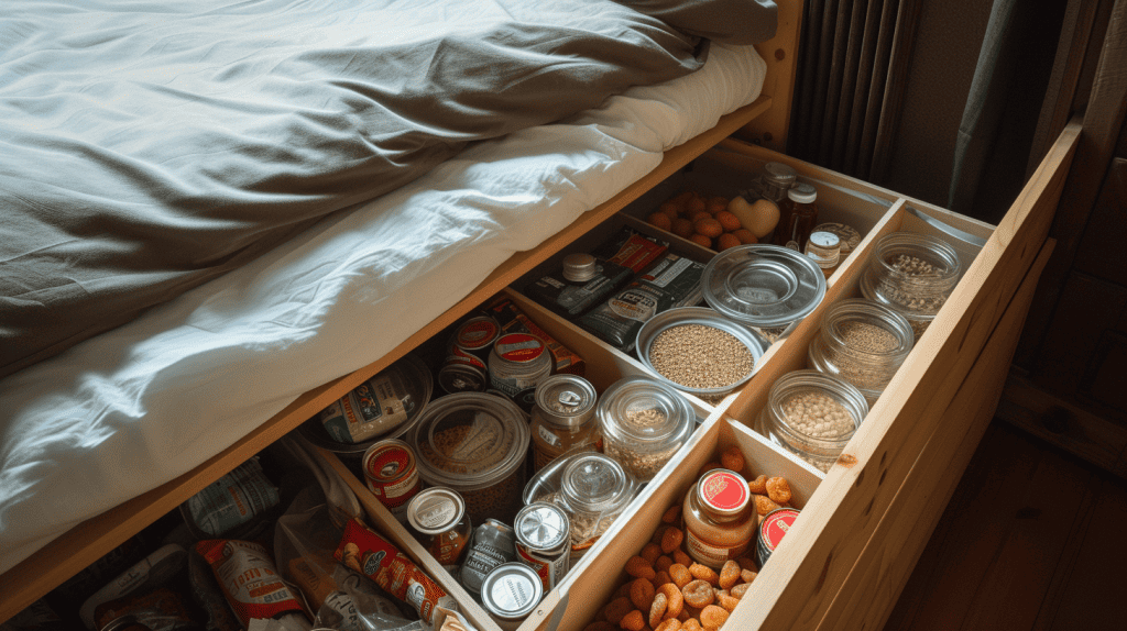 We slide in flat, airtight containers filled with essentials like dried grains, nuts, and dehydrated meals. By using vacuum-sealed bags or specially designed under-the-bed bins, we ensure these items remain safe from pests and moisture.