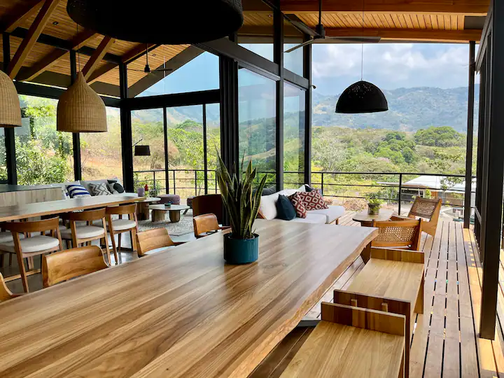 Casa en el Aire is a luxury home in Alegría Village (Los Altos) in San Mateo, Costa Rica. It’s set up for up to 4 guests with 2 bedrooms, 2 beds, and 2 bathrooms, and the main space overlooks the valley with expansive mountain views. The listing notes it’s not recommended for children under 10.